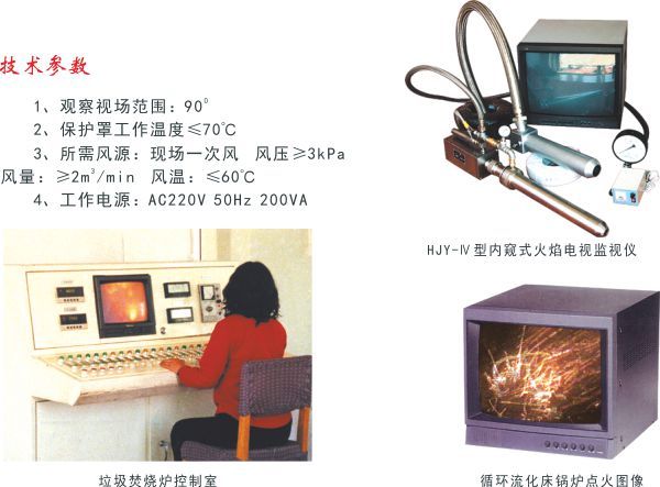 HJY-Ⅳ型內(nèi)窺式火焰電視監(jiān)視儀是用于監(jiān)測爐內(nèi)照度較低的循環(huán)流化床鍋爐及垃圾焚燒爐爐內(nèi)物料狀態(tài)的彩色工業(yè)電視系統(tǒng),該產(chǎn)品是我公司技術(shù)人員與光學(xué)研究所部分科技人員專門針對(duì)循環(huán)流化床鍋爐和垃圾焚燒爐而共同開發(fā)研制的,只要光照度大于10LUX的環(huán)境條件即能清晰成像,在國內(nèi)處于領(lǐng)先地位。對(duì)于循環(huán)流化床鍋爐,因?yàn)闋t內(nèi)為密封狀態(tài),在點(diǎn)火及投料過程中極易造成高溫或低溫結(jié)焦,而爐內(nèi)照度又很低,用國內(nèi)現(xiàn)有的爐膛火焰監(jiān)視裝置看不到爐內(nèi)物料狀態(tài)。如采用HJY-Ⅳ型產(chǎn)品可看到爐內(nèi)物料狀態(tài)并指導(dǎo)投料并及時(shí)發(fā)現(xiàn)結(jié)焦趨勢,從而避免結(jié)焦或投料過多造成點(diǎn)火過程中滅火。而垃圾焚燒爐,由于污染問題,爐體為密封式,投料后極易將火壓滅,即使在燃燒時(shí),爐內(nèi)照度也非常低,通常在300LUX以下,而國內(nèi)常規(guī)產(chǎn)品需在500LUX照度下才能工作。所以只有采用HJY-Ⅳ型產(chǎn)品,才能指導(dǎo)投料及探針插孔并在遠(yuǎn)離現(xiàn)場的操作室內(nèi)清晰看到爐內(nèi)的垃圾焚燒狀態(tài),從而實(shí)現(xiàn)安全經(jīng)濟(jì)運(yùn)行。
