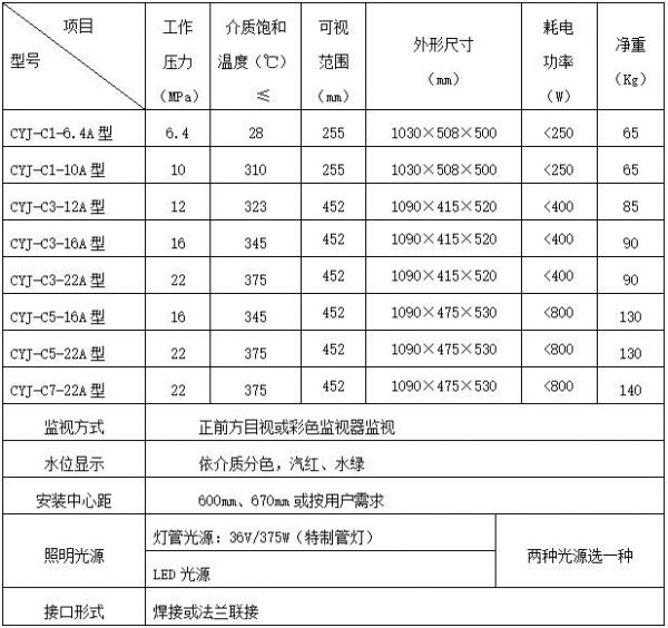 `CYJ型窗式高壓、超高壓彩色液位計是用于各發(fā)電廠、石油化工行業(yè)及各工礦企業(yè)的蒸汽鍋爐或其它壓力容器監(jiān)測水位的一次就地直讀儀表。它是在總結(jié)國內(nèi)外各種透射式雙色水位計優(yōu)點基礎(chǔ)上新研制的長窗式高壓、超高壓雙色水位計,用汽紅水綠顯示液位,無水全紅、滿水全綠。紅綠色界面即為實際水位。可在現(xiàn)場直接觀察也可以配我公司生產(chǎn)的彩色工業(yè)電視監(jiān)視系統(tǒng),在控制室內(nèi)的監(jiān)視器熒屏上遠(yuǎn)程監(jiān)測現(xiàn)場實際水位。它與其它雙色水位計相比較,具有如下幾種特點: